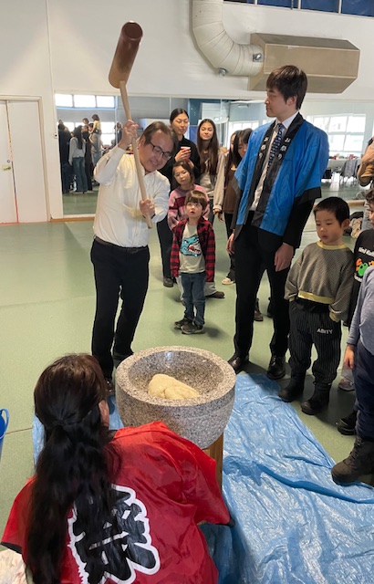 En viktig ceremoni vid nyår är att göra mochi/riskaka. Rismassan läggs i en stor stenmortel och medan en person bereder riset genom att slå med en stor klubba tar en annan person och fördelar vatten. Först ut att svinga klubban var ambassadör Mizukoshi.